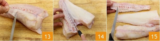 Continuad con el rape: quitad la piel exterior 13, dividid la carne siguiendo la espina 14, luego fileteadla 15, reservando también los restos.