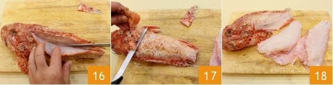 Es necesario ahora escamar el cabracho, quitarle la cola e incidirlo a lo largo del dorso 16, luego eliminad las aletas 17 y fileteadlo 18 reservando los restos.