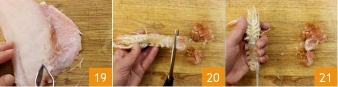 Extraed de los filetes las espinas, ayudándoos con unas pinzas 19. Limpiad finalmente las cigalas. Con las tijeras quitadles la cola 20, las patas 21