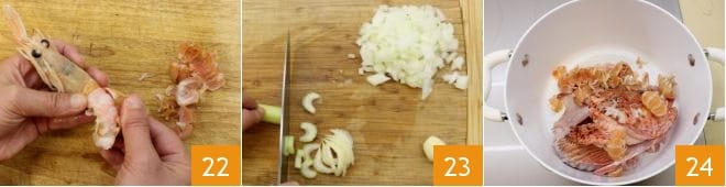 y el caparazón 22 dejando intacta la cabeza y guardando todos los restos. Después de haber pelado la cebolla, picad esta y el apio, luego picad el diente de ajo 23. En una olla a fuego moderado poned entonces todos los restos: la espina del rape, cola y aletas del cabracho, cola, patas y caparazón de las cigalas 24.