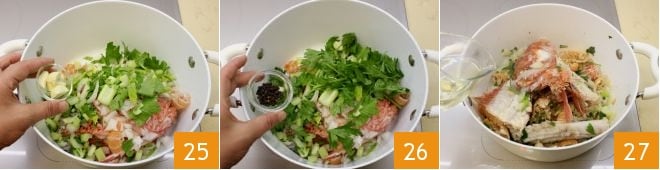 Añadid los picados de cebolla, apio y ajo 25, posteriormente la pimienta en granos enteros 26 y finalmente dejad evaporar con el vino blanco 27.