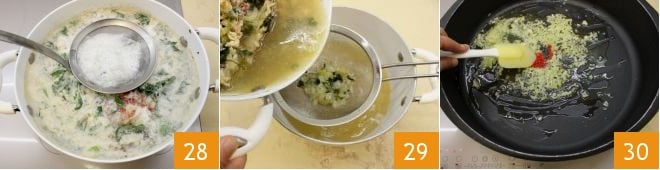 Añadid el agua y llevad a ebullición, luego bajad el fuego y proseguid la cocción durante 40-50 minutos: si es necesario, quitad con una espumadera la espuma superficial 28. Una vez listo, colad y filtrad el caldo obtenido 29, reservándolo. Continuad con el cacciucco. Picad finamente la cebolla, el ajo y el chile, luego hacedlos sofreír en una cazuela grande rociada con aceite de oliva 30.
