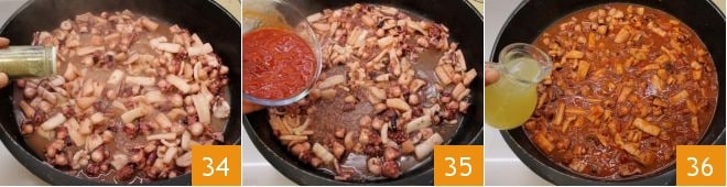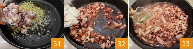 Añadid el pulpo picado y hacedlo cocer durante 10 minutos 31, luego añadid también los calamares y las sepias 32 prosiguiendo la cocción durante otros 5 minutos. Evaporad con el vino blanco 33.