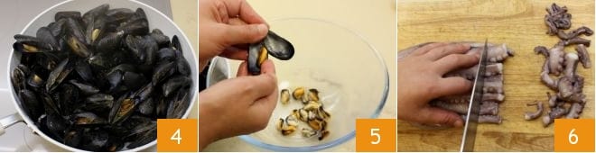 y hacedlos a fuego vivo durante 5 minutos, el tiempo necesario para que se abran 4. En este punto podéis quitar las conchas de los moluscos 5, reservando algunos mejillones enteros. Pasad al pulpo. Limpiadlo siguiendo el tutorial, luego cortad groseramente los tentáculos 6.