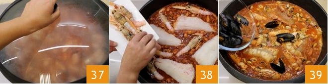 Tapad la cazuela con una tapa 37 y dejad cocer a fuego bajo durante 1 hora y 10 minutos. Cuando el pescado esté casi cocido añadid delicadamente los filetes de rape y cabracho, luego añadid las cigalas 38. Proseguid la cocción durante 10 minutos añadiendo otros 500 ml y manteniendo la tapa sobre la cazuela. Transcurrido este tiempo añadid los mejillones sin concha y los enteros 39 y coced durante los últimos 10 minutos).
