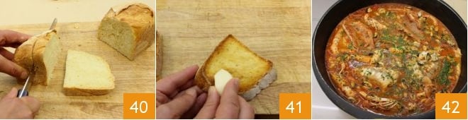 Mientras tanto, cortad el pan 40 y hacedlo tostar unos minutos en el horno en modo grill, durante 5 minutos. Cuando esté listo, frotad en cada rebanada un diente de ajo 42, finalmente añadid el perejil picado al cacciucco. El cacciucco a la livornesa está listo 43, para servir caliente junto con el pan tostado.