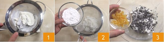 Para preparar el café a la cassata tamizad la ricotta con un colador 1, añadid el azúcar glas 2, también tamizado, y mezclad todo con movimientos amplios y rápidos, para montar la mezcla. Agregad las gotas de chocolate y la fruta confitada 3,