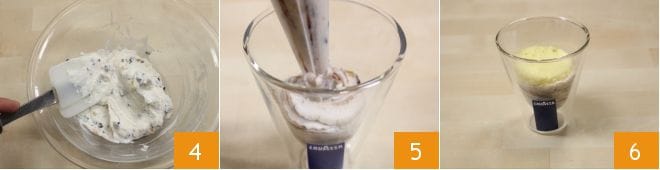 luego mezclad bien para amalgamar todos los ingredientes 4. Transferid la crema obtenida a una manga pastelera y disponedla en el fondo de cuatro vasos medianos de vidrio 5. Mientras tanto, preparad el bizcocho (siguiendo la receta que encontráis Bizcocho) y dejadlo enfriar. En este punto tomad el bizcocho y cortadlo horizontalmente por la mitad, obteniendo dos discos. De uno de los discos recortad cuatro del diámetro de 6 cm, utilizando una cortadora redonda. Colocad un disco de bizcocho en cada vaso y guardad todo en el frigorífico para que repose un par de horas.