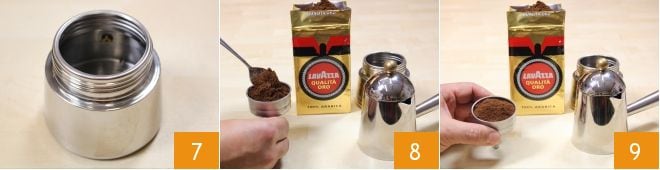 Preparad ahora el café utilizando una cafetera. Para obtener un excelente café, llenad la caldera de vuestra cafetera con agua fría y, si es posible, baja en cal, asegurándoos de no superar la válvula de seguridad 7 (de lo contrario obtendréis un café más largo). Llenad el filtro con el café molido formando un "montañita" 8, que nivelaréis golpeando el filtro sobre la mesa con movimientos firmes 9. No presionéis con la cucharilla, ni hagáis agujeros en la superficie.