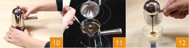 Atornillad bien la cafetera 10 (para evitar que el café se salga por los lados mientras sube), luego ponedla sobre una llama baja y constante, para obtener un café con cuerpo. A medida que el café sube, se formará una espumita densa 11; os aconsejamos no dejar que burbujee demasiado tiempo, para mantener intactos su aroma y dulzura. Vuestro café está listo: antes de verterlo, mezcladlo directamente en la moka con una cucharilla, para hacerlo más homogéneo. Sacad los vasos del frigorífico y completad todo vertiendo una taza de café caliente (aproximadamente 40 ml) para cada uno 12: ¡el café a la cassata está listo para ser disfrutado!
