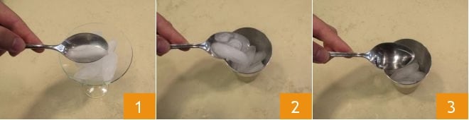 Para preparar el café shakerato, comienza enfriando la copa martini en la que servirás tu café 1. Puedes alternativamente enfriar la copa unos minutos en el congelador. Mientras se enfría, toma la coctelera y llénala con 8-10 cubitos de hielo 2 y añade el azúcar líquido 3.