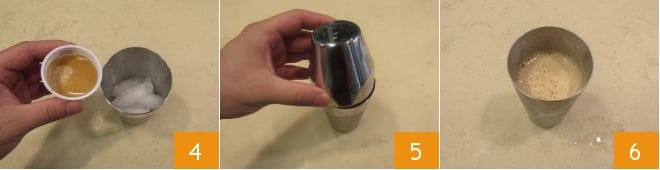 Luego, vierte el café 4. Es fundamental verter el café en la coctelera al final para evitar que el calor del café derrita el hielo y reduzca la formación de la espuma compacta que caracteriza a esta bebida. De hecho, una vez vertido el café, hay que cerrar rápidamente la coctelera 5 y agitar vigorosamente 6. Basta con agitar durante unos 10-15 segundos.