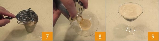 Coloca sobre la parte inferior de la coctelera el colador para filtrar el café 7. Si no tienes un colador, puedes usar una cucharilla para bloquear el hielo dentro de la coctelera. Luego, vierte en la copa ya fría 8 y... ¡disfruta de tu café shakerato 9!