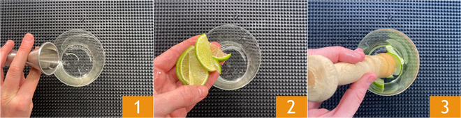 Para preparar la caipiroska de fresa, vierte el jarabe de azúcar dentro de un vaso old fashioned 1, luego añade las rodajas de lima 2 y presiona suavemente con un mortero 3.
