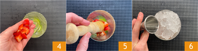 Añade la fresa cortada en cubos 4 y presiona nuevamente 5. En este punto, llena el vaso con hielo picado y añade el vodka 6.