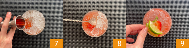 Agrega también el licor de fresa 7 y mezcla suavemente con un agitador 8. Si el nivel del hielo ha bajado, añade más hielo picado. Decora con rodajas de lima y fresas 9. ¡Tu caipiroska de fresa está lista para ser disfrutada!