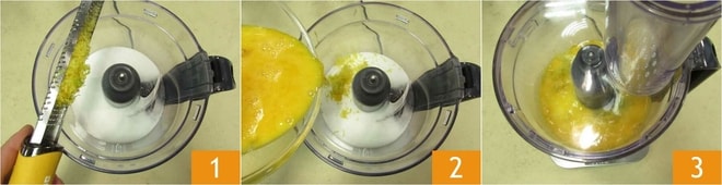 Para preparar el cake terai, lo primero que debes hacer es verter dentro de un procesador de alimentos el azúcar y la ralladura de limón, tomando solo la parte amarilla 1. Añade los huevos 2 y enciende inmediatamente el robot, a la primera velocidad 3. No será necesario montar, solo incorporar los huevos al azúcar.