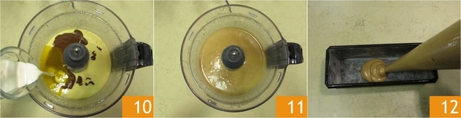 Añade también la nata fresca 10. Enciende rápidamente el mezclador hasta obtener una mezcla homogénea 11. Transfiere la mezcla a una manga pastelera y forra los moldes con papel de horno. Utilizando un cuchillo bien afilado, corta el papel en las esquinas, de esta manera la forma final del dulce será más precisa y bien cuadrada: con esta receta obtendrás 3 cakes, por lo que necesitarás 3 moldes de 5x5x16 cm. Transfiere en un molde 350 g de masa 12.