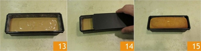 Y procede así también con los otros dos 13. Cubre con la tapa apropiada 14 y hornea en horno estático precalentado a 175° durante 35 minutos. Saca entonces el cake, abre la tapa sin quemarte 15,