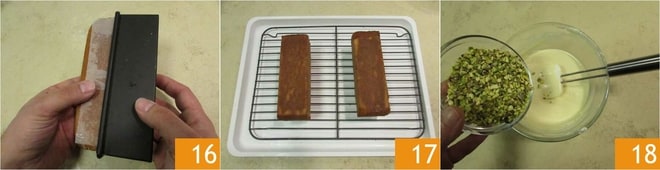 extráelo del molde 16 y voltéalo sobre una rejilla. Elimina el papel de horno, deja enfriar completamente a temperatura ambiente 17, luego congela el cake por al menos 2 horas. Poco antes de glasearlo prepara la cobertura de chocolate. Coloca el chocolate blanco en un bol y derrítelo en el microondas o al baño maría. Añade el granillo de pistacho 18,