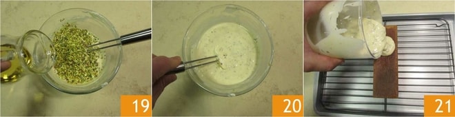 el aceite de arroz 19, y mezcla bien 20. Deberás obtener un resultado homogéneo y fluido. En este punto, el glaseado deberá alcanzar la temperatura de 35°, para mayor comodidad puedes transferirlo a un recipiente largo y estrecho. Toma de nuevo el cake del congelador, colócalo nuevamente sobre la rejilla, con un plato debajo que servirá para recoger el exceso de glaseado. Vierte entonces el glaseado sobre el cake 21