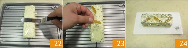 y con una espátula deja deslizar hacia abajo el exceso de glaseado 22. Mueve ligeramente la rejilla para disponerlo de manera uniforme y cubrir completamente el cake. Añade en los 4 bordes las decoraciones de chocolate y en la superficie tiritas de limón confitado 23. Transfiere a un plato de presentación y termina con la plata en polvo 24. Espera a que el cake esté completamente descongelado en su interior antes de servirlo.