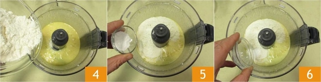 Luego añade la harina tamizada previamente 4, la levadura en polvo 5 y la sal 6.