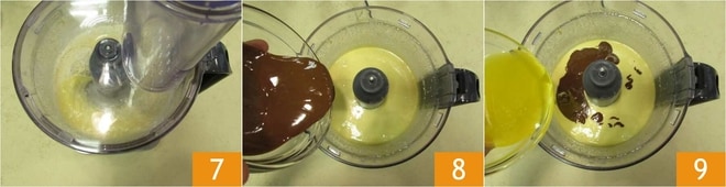 Haz girar todo rápidamente 7, de esta manera no se creará la red glutínica. Añade entonces la pasta de avellanas 8 y la mantequilla clarificada, llevada a 40° 9.