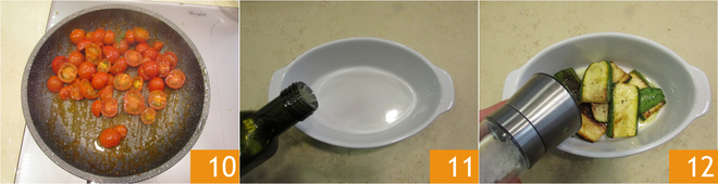 Deja cocinar durante unos 5 minutos a fuego bajo 10. Ahora toma la fuente (la mostrada es para 2 personas, puedes usar dos), engrasa el fondo 11 y distribuye una capa de calabacines, sala 12 y pimienta.