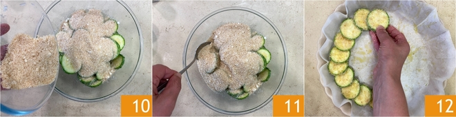 Verted casi todo el empanado sobre los calabacines 10, mezclad bien 11 y colocadlos en una bandeja redonda forrada con papel de horno 12