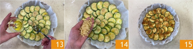 Una vez dispuestos en forma de estrella, pincelad los calabacines con una mezcla de agua y el aceite de oliva virgen extra restante 13. Antes de hornear la bandeja, añadid el empanado reservado 14. Coced en horno estático a 200 grados durante 25 minutos, luego continuad otros 5 minutos en modo grill para obtener un delicioso gratinado. ¡Los calabacines al horno con pan rallado y Parmesano están listos 15!