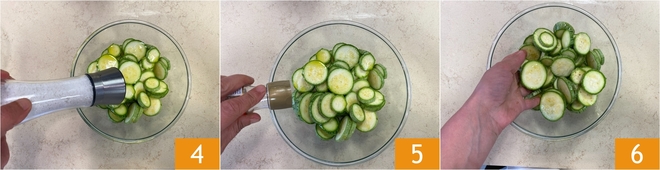 Para preparar los calabacines al horno con pan rallado y Parmesano, comenzad recortando los extremos de los calabacines 1. Cortadlos en rodajas 2 y trasladadlos a un bol, vertiendo casi todo el aceite de oliva virgen extra 3.