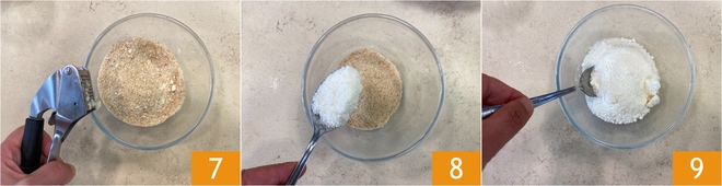 Ahora ocupaos del empanado. En un bol con el pan rallado, machacad el diente de ajo 7. Añadid el Parmesano rallado 8 y mezclad con una cuchara 9.