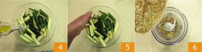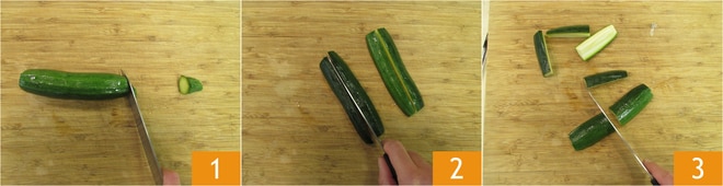 Para preparar los calabacines al horno, comenzad cortando las extremidades 1. Luego cortad los calabacines por la mitad 2 y nuevamente por la mitad para obtener 8 bastoncitos gruesos por cada calabacín 3.
