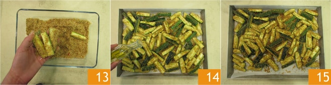 Mezclad antes de sumergir y empanar los bastoncitos de calabacín 13. Transferid todo a una bandeja de horno con papel de horno debajo y untad la superficie con un poco de aceite 14. Luego cocinad en horno estático, ya caliente a 200°, durante unos 20 minutos o hasta que se doren. Sacad del horno y servid inmediatamente vuestros calabacines al horno 15.