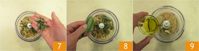 Aromatizad con hojas de tomillo, agujas de romero 7 y hojas de salvia 8. Dad una breve triturada y luego añadid el diente de ajo dividido y sin el germen y el aceite de oliva 9.