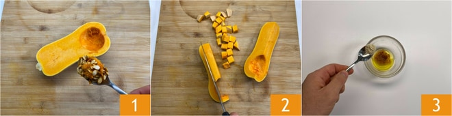 Para preparar la calabaza en cubos en freidora de aire, lo primero es eliminar las semillas y filamentos internos, si los hay 1. Quita también el tallo y sin pelarla, córtala en cubos de aproximadamente 1,5 cm 2. En un bol pequeño, vierte el aceite, la punta de una cucharadita de pimentón y la misma cantidad de ajo en polvo 3.