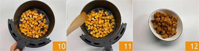 Extiéndelos de modo que no se sobrepongan 10 y cocina en la freidora de aire a 200° durante unos 15-20 minutos, girándolos cada 5 minutos 11. Cuando la calabaza esté suave y dorada al punto correcto, podrás servirla 12.