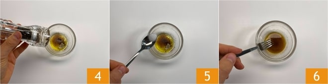 Añade la pimienta negra molida 4, una pizca abundante de sal fina 5 y emulsiona con un tenedor 6.