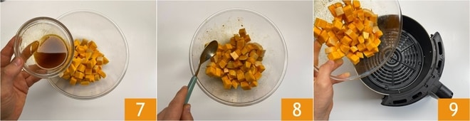 Usa esta emulsión para condimentar la calabaza en un bol 7, mezclando bien 8. Luego, transfiere la calabaza a la cesta de la freidora de aire (nosotros hemos utilizado una freidora con una capacidad de 6 litros) 9.