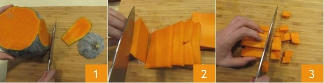 Para preparar la calabaza gratinada, primero limpia la calabaza quitando la piel exterior con un cuchillo 1. Corta la calabaza ya limpia en rodajas 2, luego en tiras y finalmente en cubos de aproximadamente 1 cm 3.