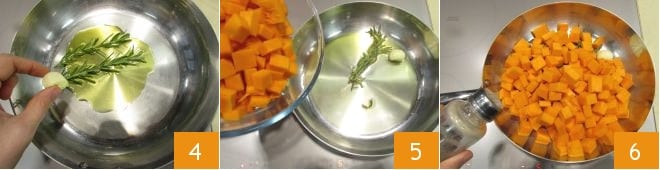 Toma una sartén adecuada también para la cocción en horno (o utiliza una sartén antiadherente y luego transfiere todo a una bandeja), calienta el aceite de oliva, añade las ramitas de romero y el diente de ajo 4 y sofríelos a fuego medio durante 5 minutos. En este punto, añade los cubos de calabaza 5, salpimenta al gusto 6 y deja cocinar durante unos 15 minutos, removiendo de vez en cuando.