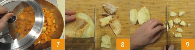 Cuando falten 5 minutos para el final de la cocción, baja el fuego y cubre la sartén con la tapa 7. Una vez que la calabaza esté cocida, retira el ajo y el romero de la sartén. Ahora precalienta el horno a 190° en modo ventilador y pasa a preparar el pan rallado: toma el pan duro, quita la corteza con un cuchillo 8 y corta la miga en cubos 9: necesitarás 50 g.