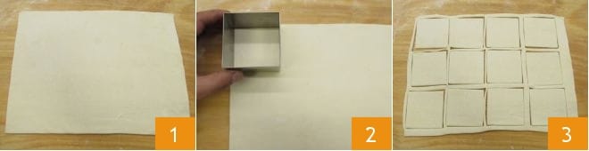Para realizar las calabacitas de hojaldre extiende la masa en una superficie de trabajo ligeramente enharinada 1. Con un cortador de 8 cm de diámetro corta 12 cuadrados 2. Elimina la masa sobrante 3.