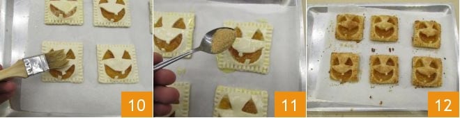 pincela la superficie con la yema mezclada con un poco de agua 10, espolvorea con azúcar moreno 11 y hornea en horno precalentado a 180° durante 25 minutos. Transcurrido el tiempo de cocción, tus calabacitas de hojaldre estarán bien doradas en la superficie 12: ¡disfrútalas tibias o incluso a temperatura ambiente!