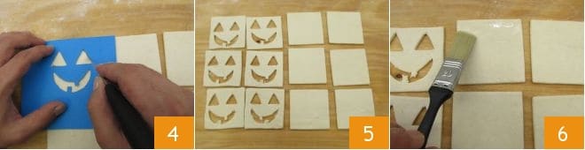 y recorta en la mitad de los cuadrados la forma de los ojitos y la boca, inspirándote en los recortes clásicos de la calabaza de Halloween. Para realizar este paso te aconsejamos recortar primero la forma en un cartón para facilitarte (4-5). Pincela los bordes de los cuadrados enteros con un poco de agua 6.