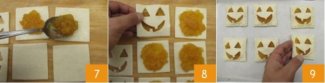 Coloca en el centro una cucharada de mermelada de naranjas 7, luego superpone el hojaldre recortado con la forma 8 y adhiere bien los bordes para evitar que el relleno se salga durante la cocción. Coloca las calabacitas de hojaldre sobre una bandeja forrada con papel de horno 9.
