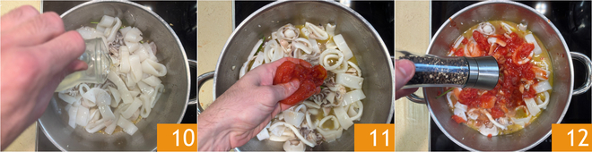 Rocía con vino blanco 10 y deja evaporar toda la parte alcohólica. Añade los tomates pelados 11, ajusta de sal y pimienta 12.