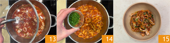 Cubre con la tapa 13 y cocina, a fuego medio, durante unos 20 minutos o hasta que los calamares estén tiernos. Si la salsa está demasiado líquida, deja reducir un poco más continuando la cocción por unos minutos más. Retira del fuego, elimina los tallos de perejil, añade el perejil picado 14 y mezcla. Sirve y completa con más perejil picado. Tus calamares a la messinesa están listos para ser disfrutados 15.