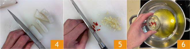 Corta el manto en anillos de aproximadamente 3 cm 4. Pica finamente el ajo y la guindilla 5. En una olla calienta un chorrito de aceite, luego añade el ajo y la guindilla 6 y sofríe por unos minutos.